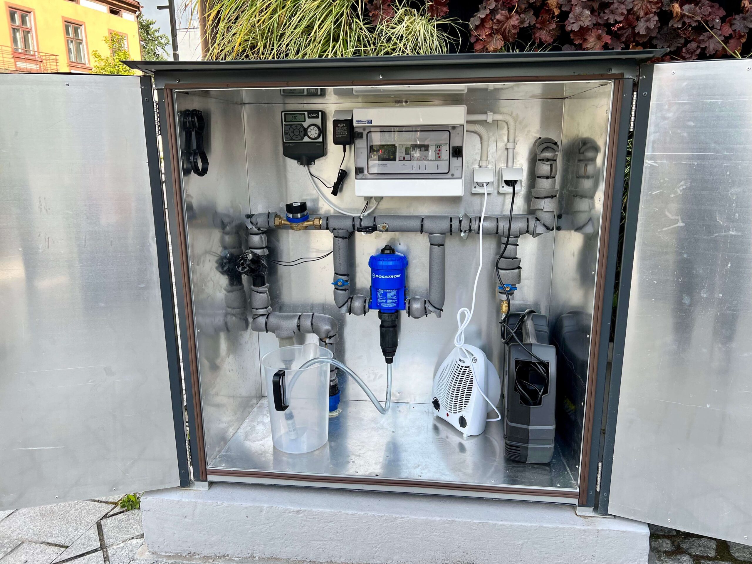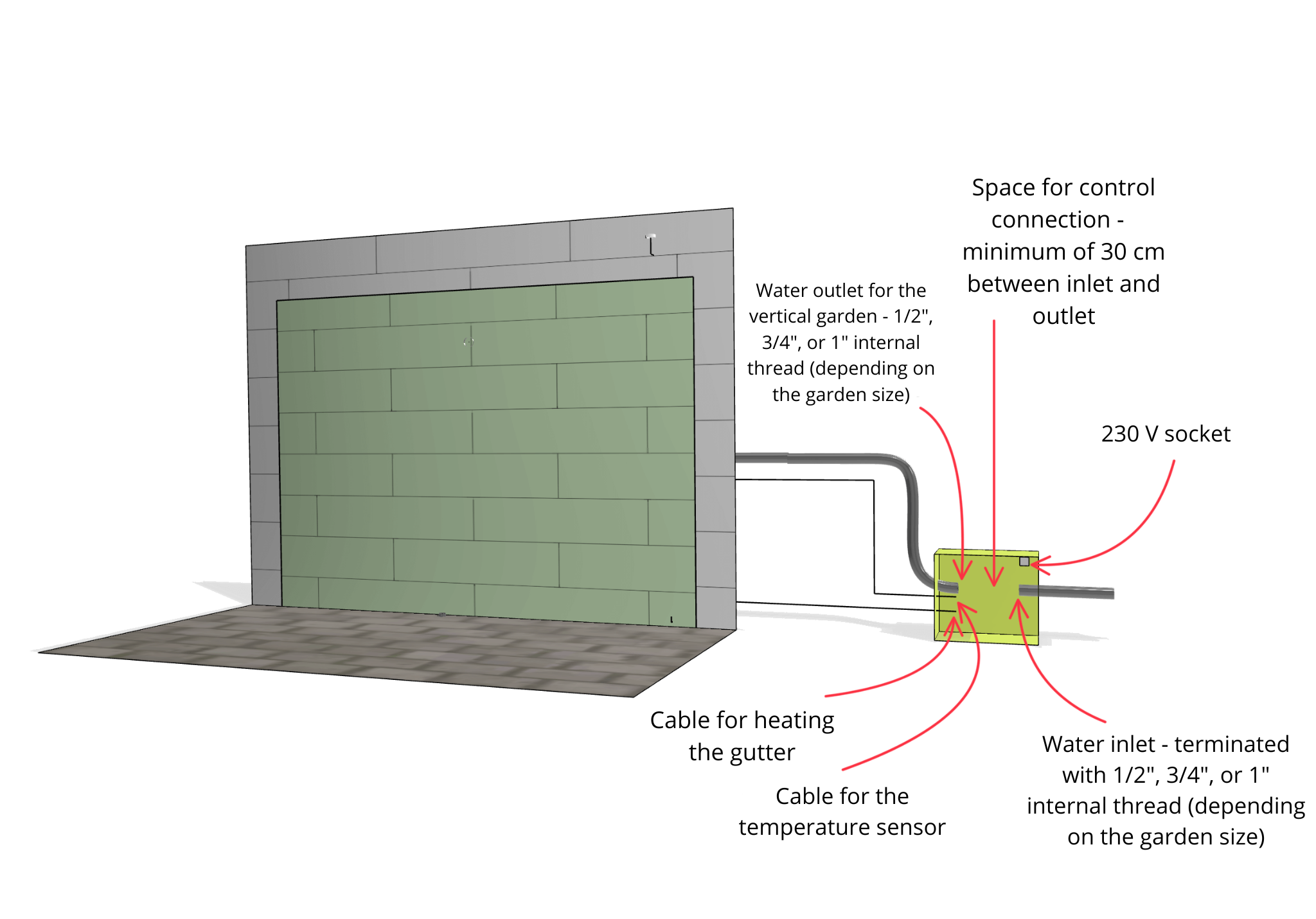 The control system for the vertical garden should be located inside the building. External green walls are irrigated even in winter, so the control system should be placed in a warm area to prevent water freezing near the solenoid valves.