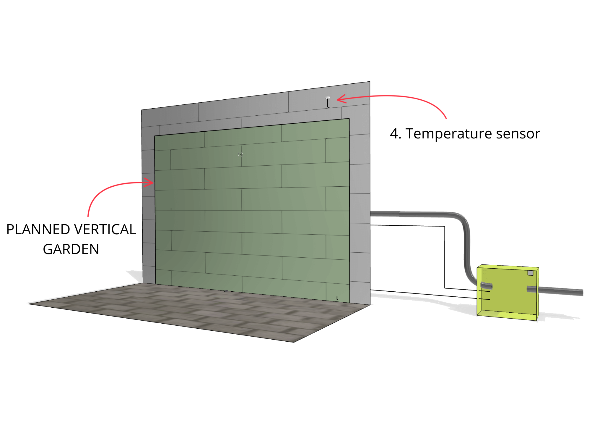 The temperature sensor is designed to monitor the air temperature in the vicinity of the green wall (in the shade). Its installation involves running a 0.5 x 2mm cable from the control unit to the outside, near the vertical garden.