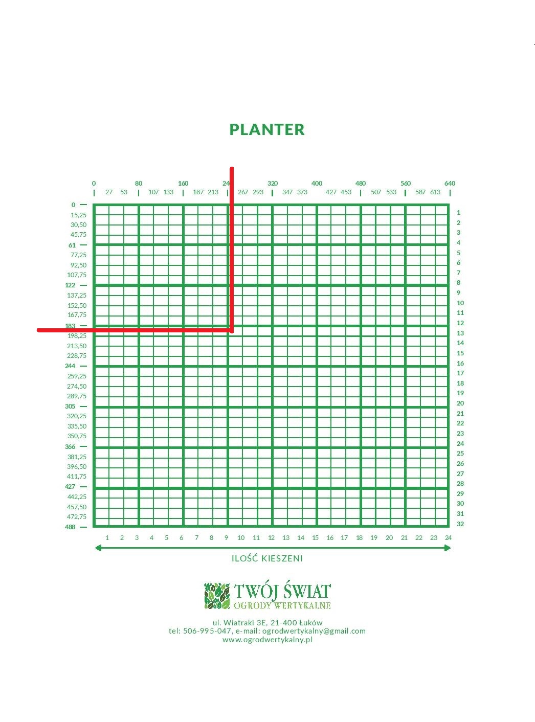 Dolny rząd oraz prawa strona pomocne są przy wyliczeniu ilości kieszeni. Przypuśćmy, że nasza zielona ściana będzie o wymiarze 183 cm x 240 cm.