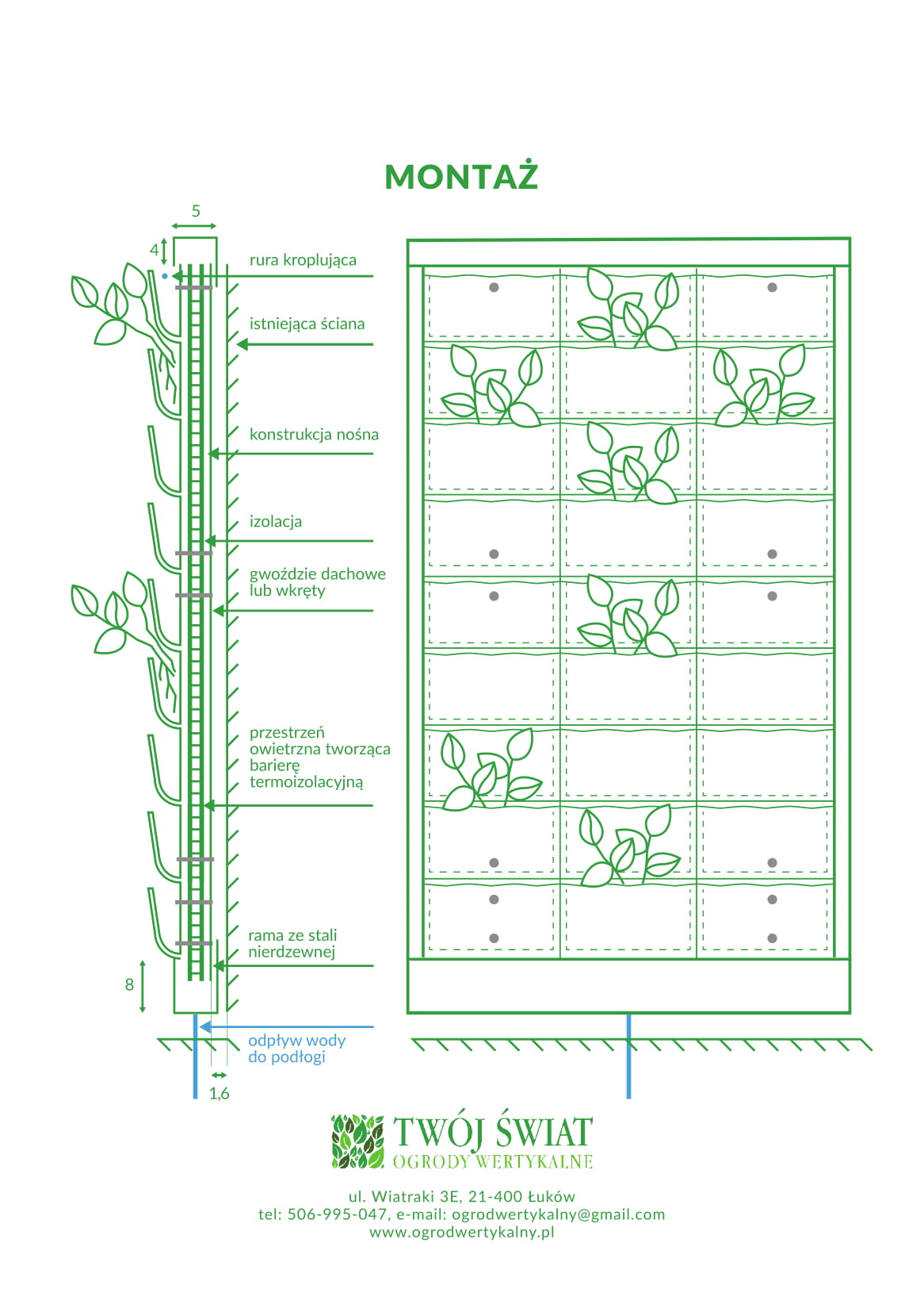 Przy zastosowaniu paneli do wykonywania ogrodów wertykalnych FLORAFELT lub VERTICAL PLANTERS wykonanie rynny zbiorczej oraz ram jest bardzo proste. W załączeniu instrukcja z przekrojami ram, dla rozwiązań które najczęściej stosujemy my.